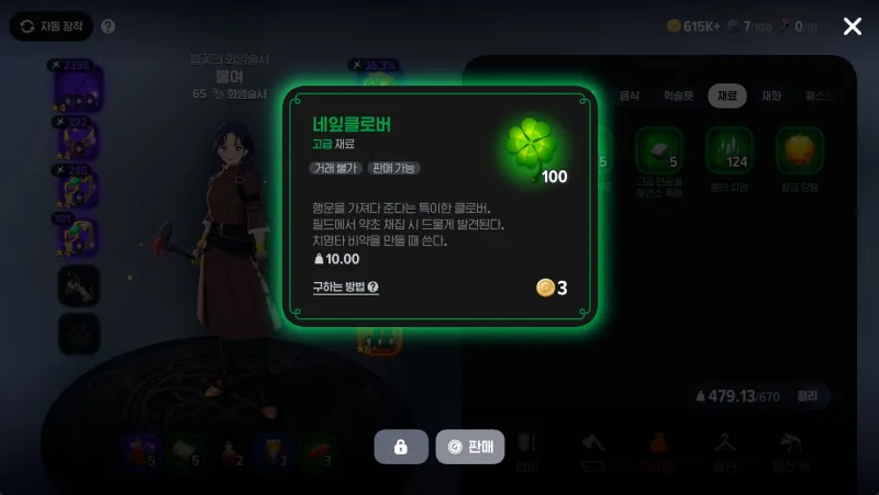 - 자동 채집 설정: 자동 채집 기능을 적극 활용하세요! 목표 아이템(예: 네잎클로버 100개)을 설정하고 잠들기 전이나 다른 일을 할 때 자동 채집을 돌려놓으면 효율적으로 재료를 모을 수 있어요. 다만, 주변 몬스터나 환경 요소를 고려하여 안전한 장소를 선택하는 것이 중요해요.