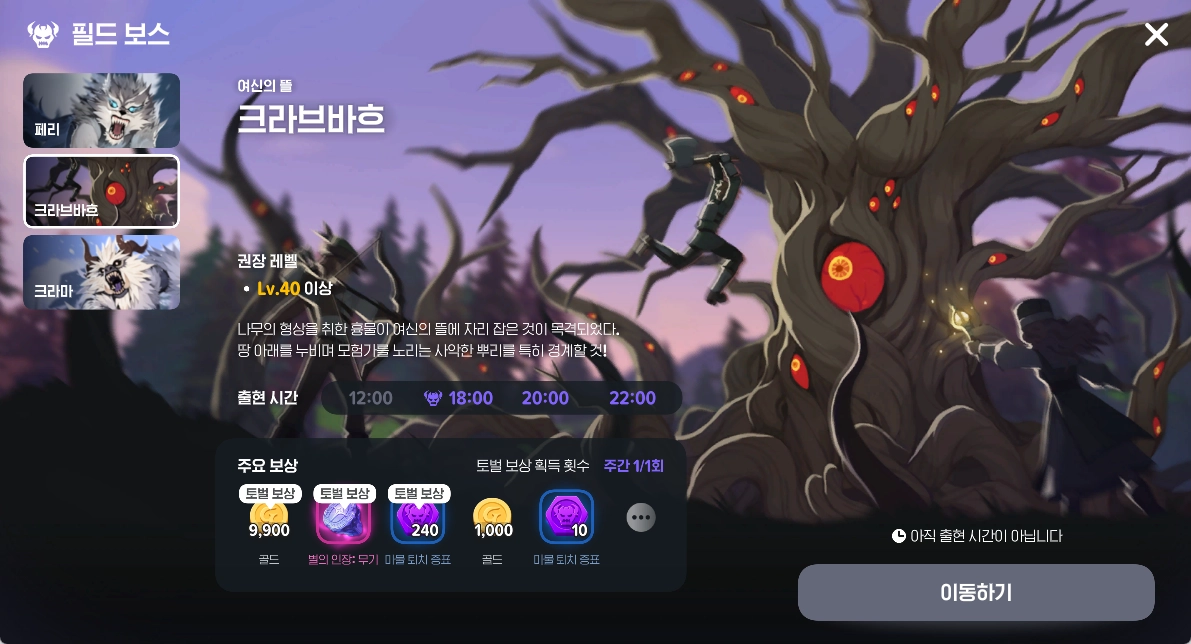 - 보스 특징: 튜토리얼에서 만났던 거대 나무 괴물 크라브바흐가 필드보스로 등장해요. 강력한 범위 공격과 패턴을 가지고 있지만, 비교적 측면이나 후방을 공략하면 안정적으로 딜을 넣을 수 있어요.